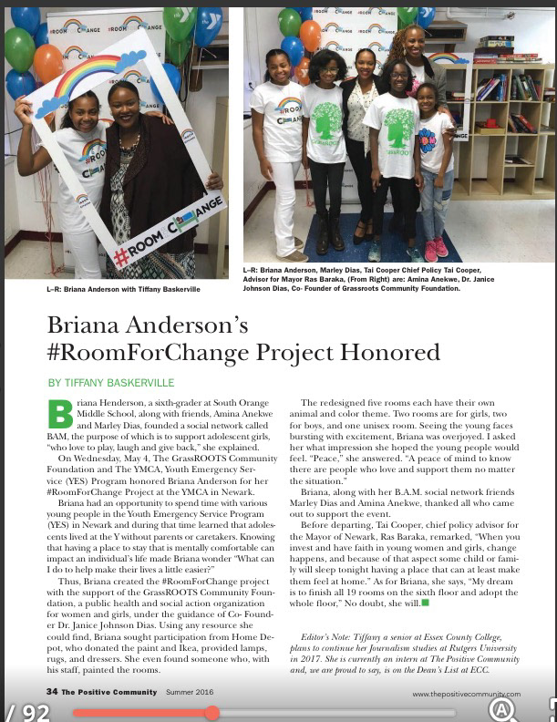 Newark- On Wednesday, May 4, The Grassroots Community Foundation and The YMCA, Youth Emergency Service (YES) Program honored, Briana Anderson for her #RoomForChange Project at the YMCA in Newark. Briana who had a opportunity to spend time with various young people in the youth crisis program (YES) in Newark during her time learned more about the young people and their living conditions. She learned that children lived there without parents or caretakers.